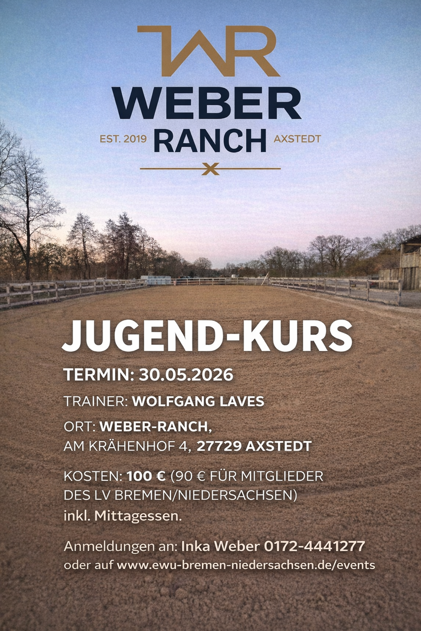Wir freuen uns, euch mitzuteilen, dass es auch 2026 wieder ein Jugendcamp geben wird. 😍✨ 🗓️ Datum: 31.07.–02.08.2026 📍 Ort: Kamphuis Quarterhorses Eichenallee 72 D-49733 Haren 🏇🏻 Trainerinnen: Joline Kamphuis und Lena Wolff Veranstalter: EWU Bremen/Niedersachsen Ansprechpartnerin vor Ort: Joline Kamphuis Onlinenennung: Das Anmeldeformular könnt ihr per E-Mail an jugend1@ewu-bremen-niedersachsen.de senden 😁 💶 Kosten: – 100 € für EWU-Mitglieder – 150 € für Nicht-Mitglieder Mit Joline und Lena als Trainerinnen können wir nahezu alle Disziplinen abdecken und hoffen, dass somit für jeden etwas dabei ist. Wir freuen uns auf viele motivierte Teilnehmerinnen und ein unvergessliches EWU-Jugendcamp 2026! 🐴✨